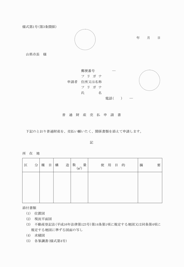 第3条 法定外公共物用途廃止の決定を受けた者は、普通財産売払申請書(様式第1号)に関係書類を添え市長に提出しなければならない。