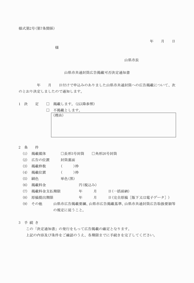 5 広告の掲載を決定したとき、又は掲載できないと決定したときは、山県市共通封筒広告掲載可否決定通知書(様式第2号)により通知するものとする。