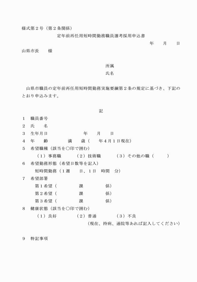 2 定年前再任用短時間勤務を希望する者は、市長の指定する日までに定年前再任用短時間勤務職員選考採用申込書(様式第2号)を、市長に提出しなければならない。