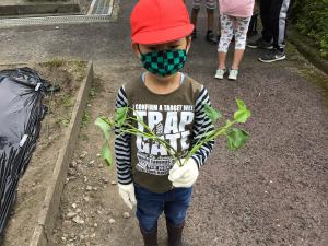 11日(水曜日)、1、2年生がサツマイモの苗を植えました。1年生の子にとっては初めての苗付けでしたが、先生が作ってくれたさし穴に上手に入れ、優しく土をかぶせ、水やりをすることもできました。一人4本も苗を植えたので、一面サツマイモ畑に変わりました。秋の収穫が楽しみですね。