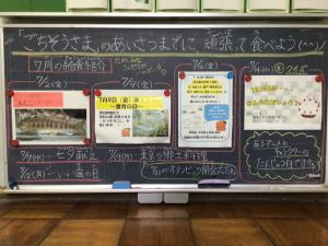 ランチルーム前の黒板です。今月の給食紹介の掲示です。岐阜県産の「あまご」や伊自良で収穫された「とうもろこし」、おいしかったですね。七夕献立や食育の日、いい歯の日など、〇〇の日献立が多かったですね。 明日14日はクイズになっています。献立と関係があるようです。16日は伊自良中学校1年生4人が6年生の時に考えた献立です。19日には、間近にせまってきたオリンピックにちなんで、東京の郷土料理の献立のようです。 1学期の給食も残り4日です。楽しみながら残さず食べましょう。