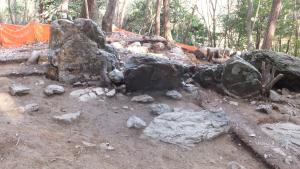 巨大な石材(最大で幅約2メートル50センチメートル、高さ約2メートル)を使用した巨石石垣、約1メートル前後の石材による立石列、斜面側の石垣により城門を形成していることを確認しました。また、巨石の裏込めには10~50センチメートルの裏込め石が充填されていました。