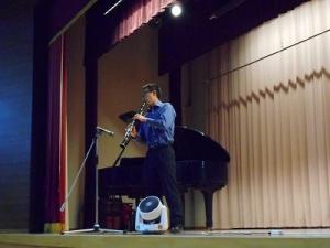 コロナ禍で中止になった合唱交流会。その代替として音楽に関する行事で生徒たちに生の音楽を聴いてもらい楽しんでもらおうと先生たちで考えたのが,この音楽鑑賞会。校長の教え子で現在も音楽活動を続けている横山信さんに相談したところ,サックスの彼に加えて,クラリネット&ピアノの若山大祐さん,トロンボーン&ボーカルの榎谷太一さんにもボランティアで参加してもらえることになりました。さらに,本校の大原教諭も歌を披露しました。彼は国立音大とシドニー音楽院で声楽を学び,オペラデビューもしている声楽家です。伴奏に本校講師の野村先生も参加しました。「名探偵コナン」「となりのトトロ」「となりのトトロ」「美山中校歌」など,生徒に親しみのある楽曲を披露してくれました。